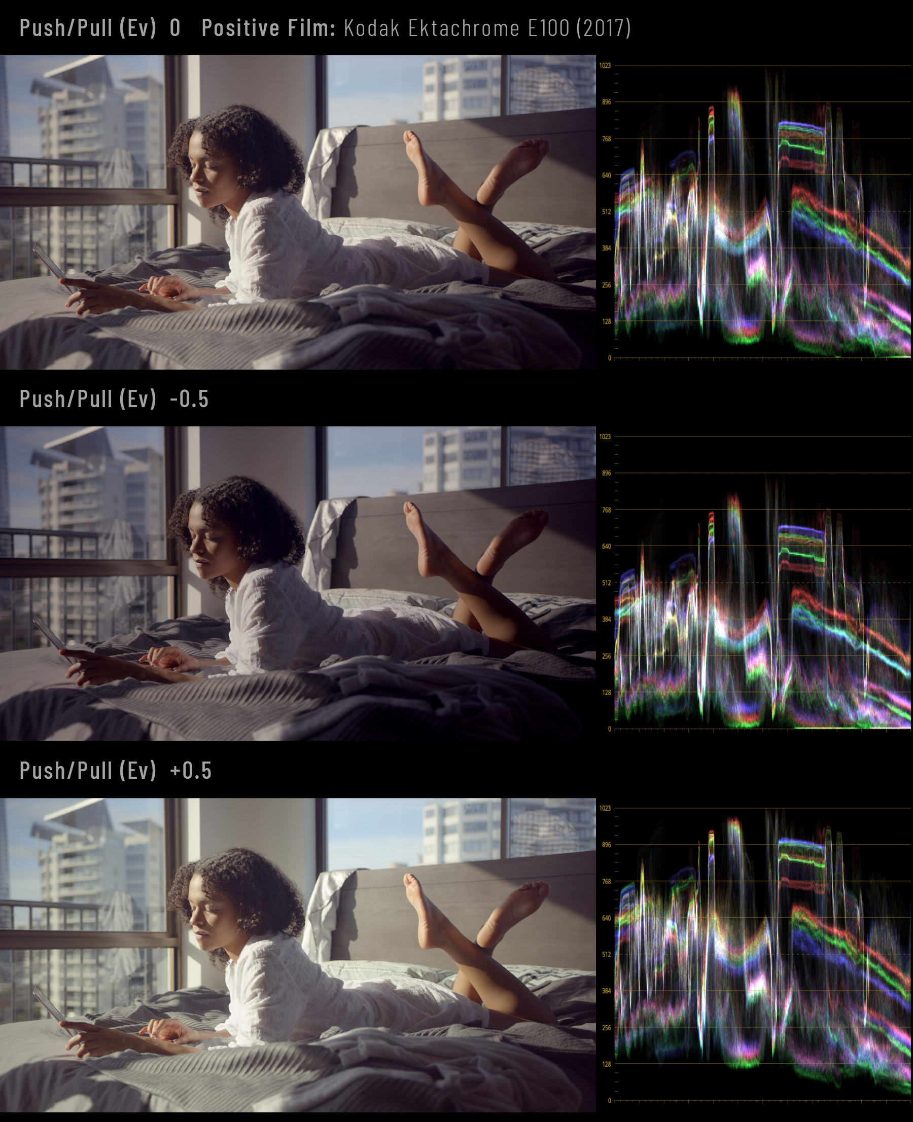 Famous Kodak Ektachrome E100 (2017) positive film behaves as expected: Push/Pull here acts as film exposure control.