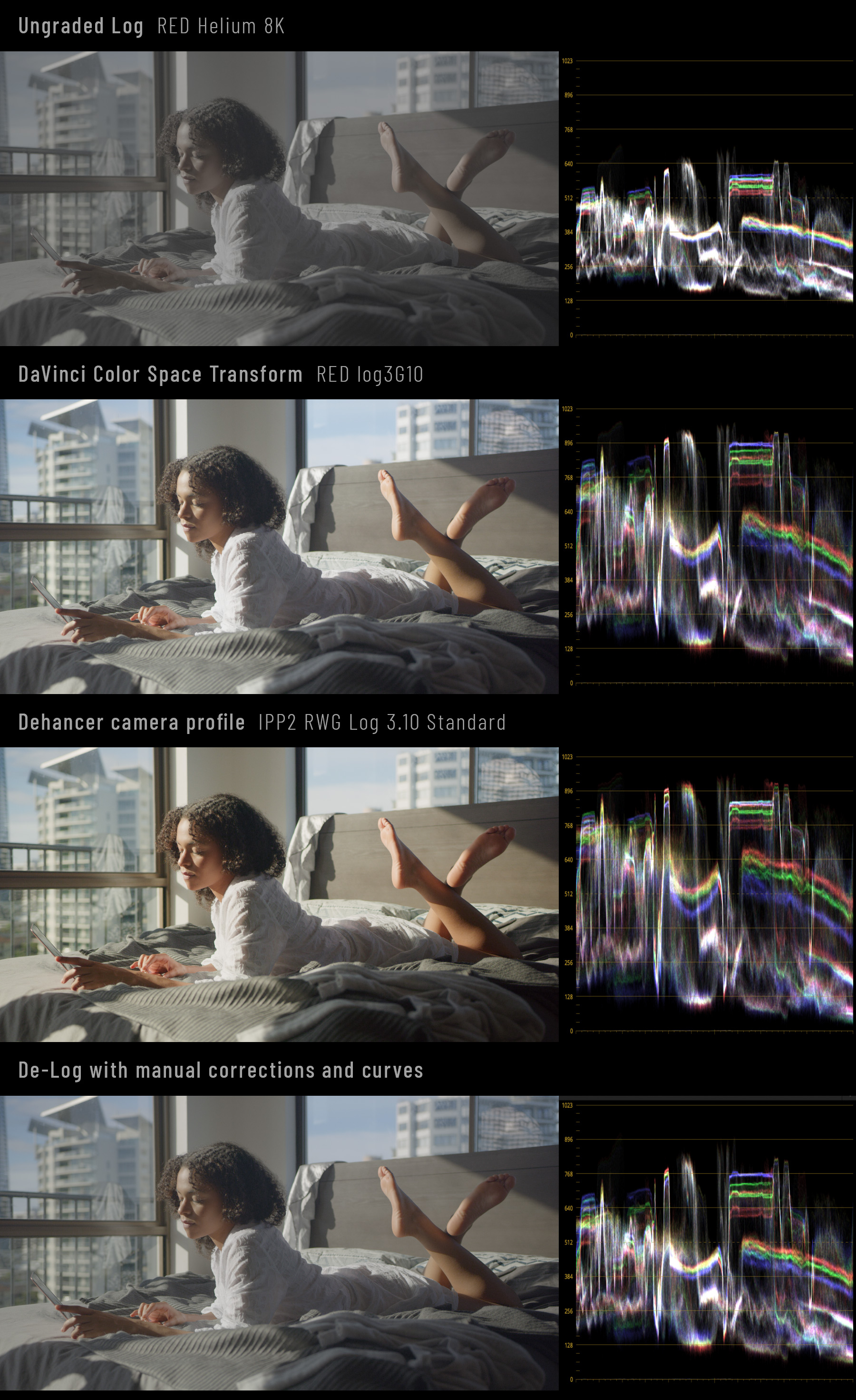– Manual de-Log with custom curves saves detail in shadows and highlights and makes processing more flexible.